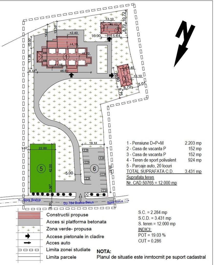 Proprietatea este amplasată pe un teren în ușoară pantă, oferind o panoramă impresionantă. În preț este inclus și un proiect imobiliar deja dezvoltat (pensiune + case de vacanță), evaluat la aproximativ 8.000 de euro, iar casa de vacanță are deja autorizație de construcție.