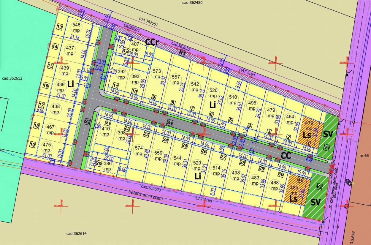 31 parcele de teren de case cu o suprafață medie de 482 mp.