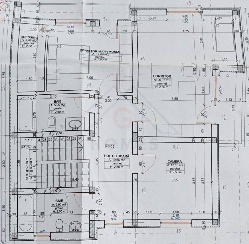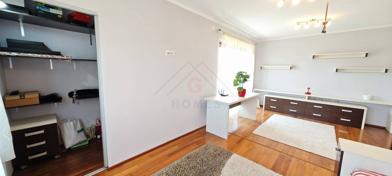 - Etaj: 3 camere cu 3 spatii depozitare, doua bai, hol, balcon