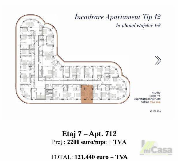 miCasa imobiliare vă prezintă un apartament modern, situat la etajul 7 al unui complex rezidențial deosebit, cu o suprafață totală de 55,2 mp. Apartamentul este de tip 12, conform planului etajelor 1-8, și beneficiază de o distribuție optimă a spațiilor.