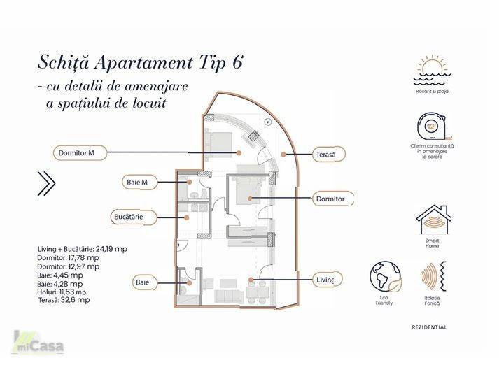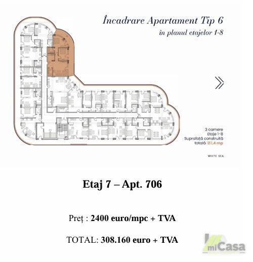 miCasa imobiliare vă prezintă un apartament modern, situat la etajul 7 al unui complex rezidențial deosebit, cu o suprafață totală de 128,4 mp. Apartamentul este de tip 6, conform planului etajelor 1-8, și beneficiază de o distribuție optimă a spațiilor.