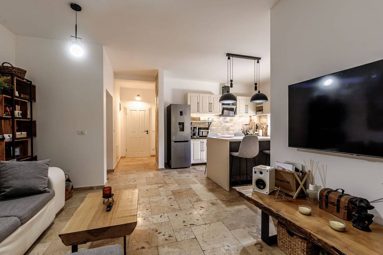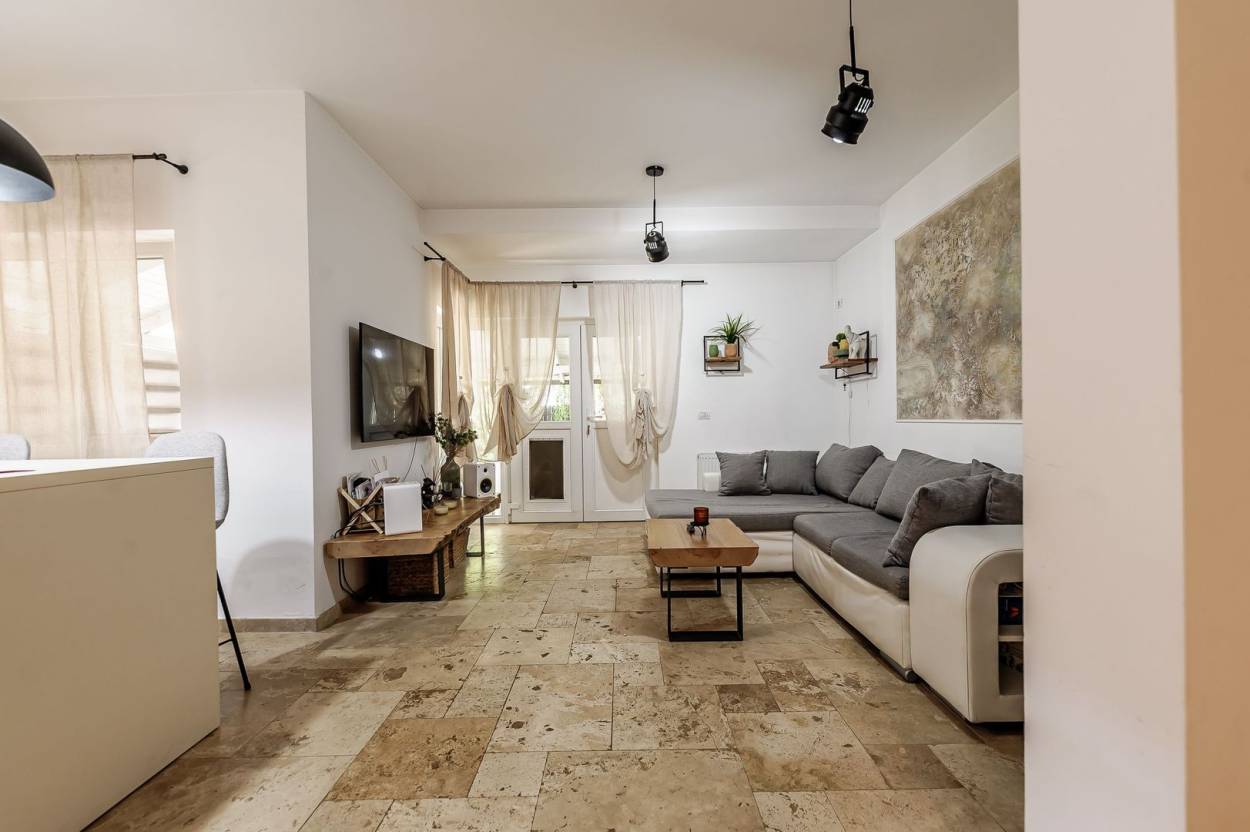 Parter: living spațios cu bucătărie open-space, baie modernă și dormitor luminos