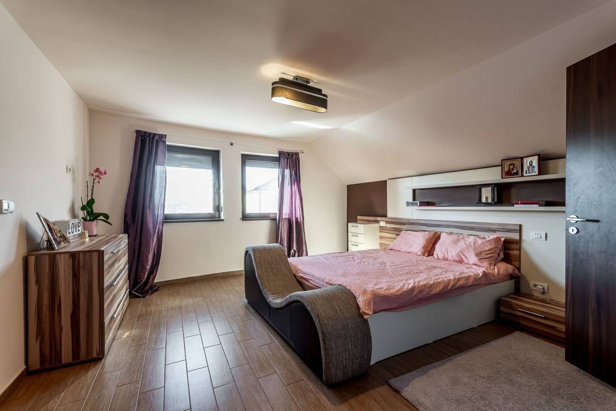 Mansardă: matrimonial cu baie+dressing, 2 dormitoare, baie, dressing separat