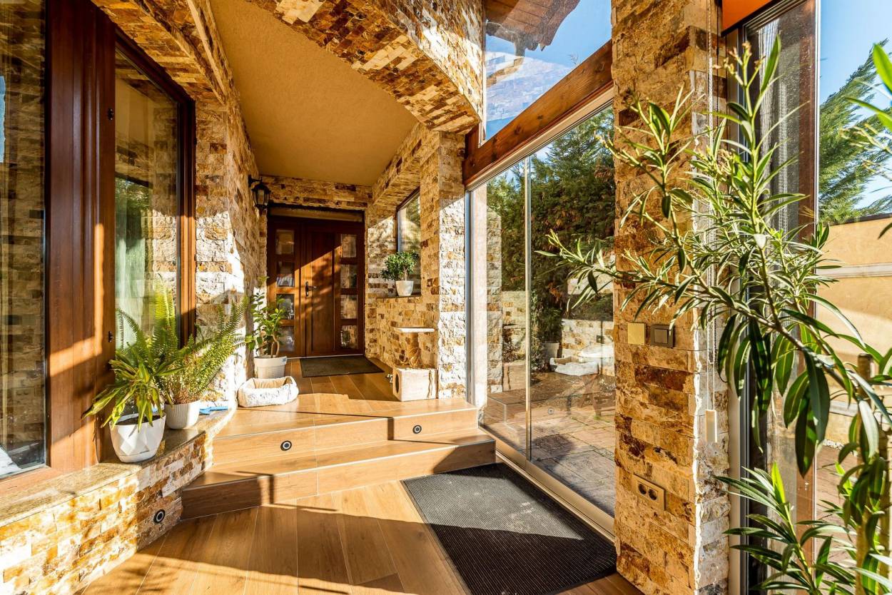 Exterior complet amenajat: garaj 2 mașini automatizat, BBQ, jacuzzi 5 persoane, terasă 40 mp închisă cu sticlă securizată glisantă + bucătărie exterioară cu granit; în spate: magazie, padoc câini, pomi fructiferi.