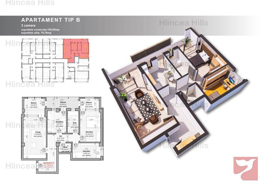 Apartament 3 camere TIP B, Hlincea Hills, fara comision