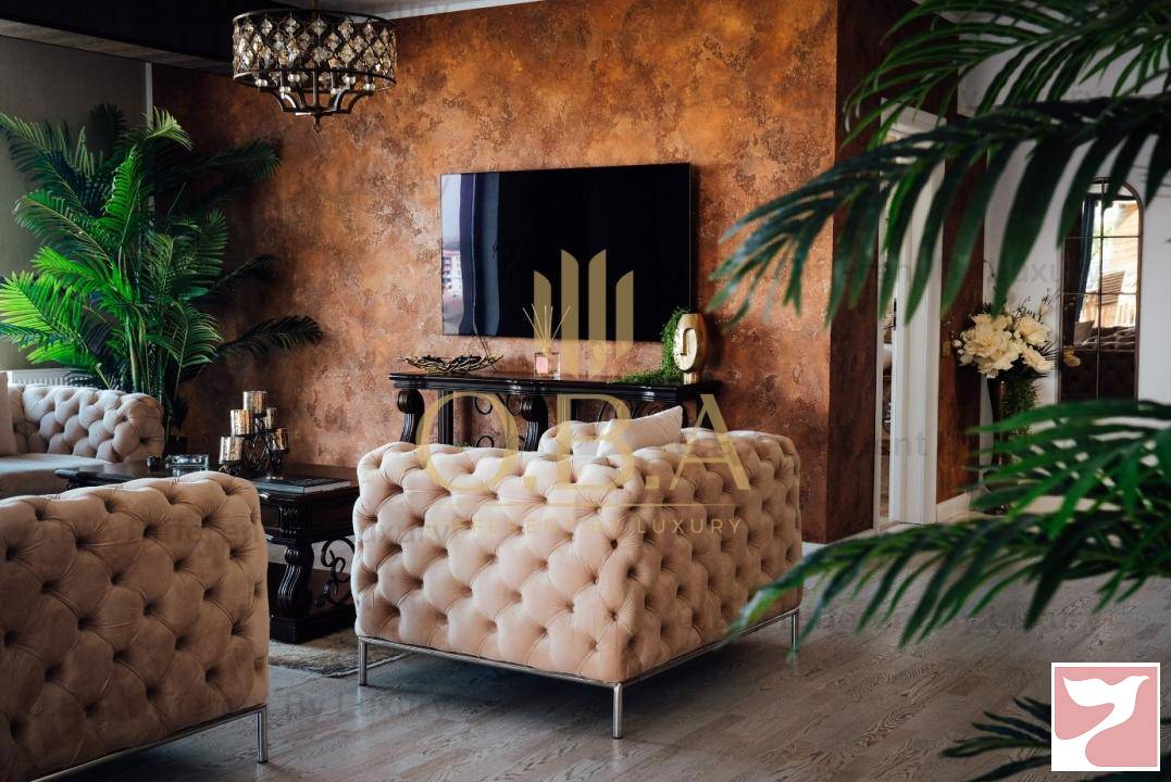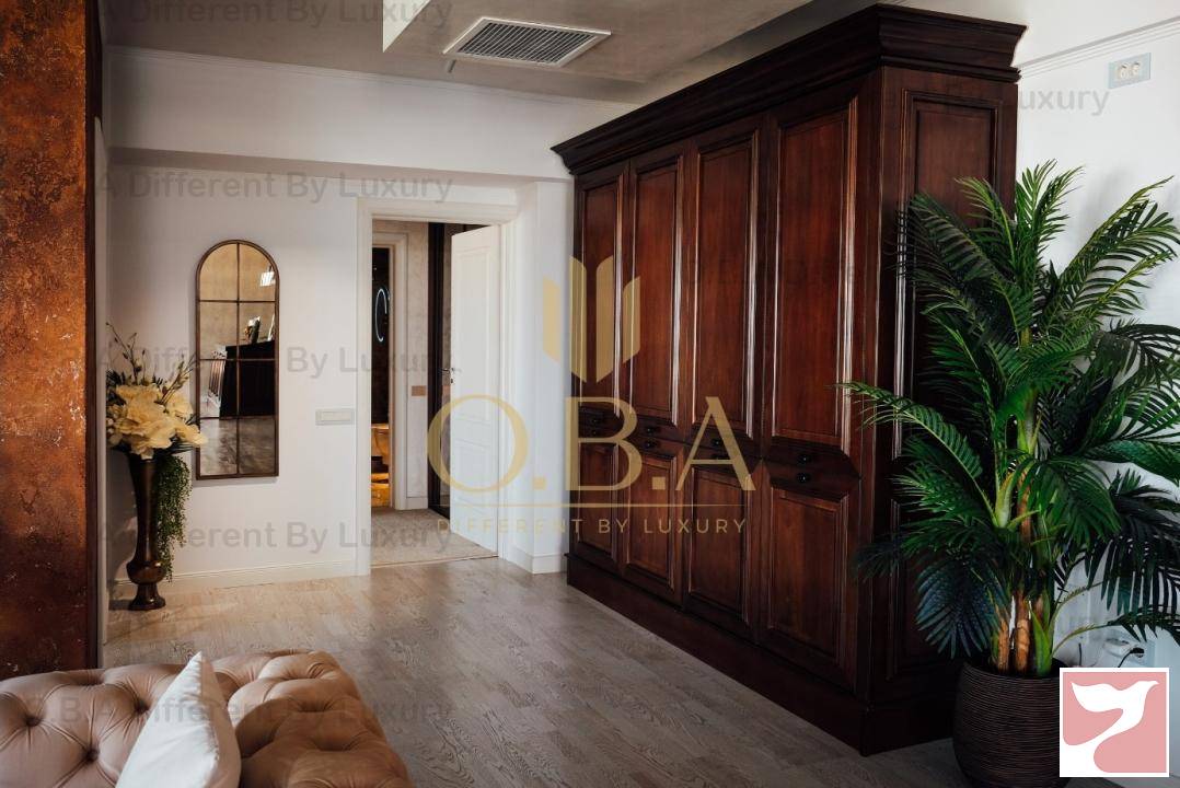 Apartamentul este complet utilat, mobilat și oferă tot confortul unei locuințe noi, având încălzire în pardoseală, centrală termică pe gaz și instalație casetata de aer condiționat. Băile sunt echipate complet, placate în marmura naturala, având suprafețe generoase. Materialele au fost alese cu mare atenție, conferind acestora o eleganță aparte. Fiecare piesă de mobilier a fost atent aleasă astfel încât să se păstreze linia de design. Decorarea este realizată într-o manieră neutră, având tonuri calde de crem și maro, toate fiind armonizate cu ajutorul unui designer experimentat. Mobila clasică va fi mereu la modă. Accentele clasice îi asigură unicitate.
