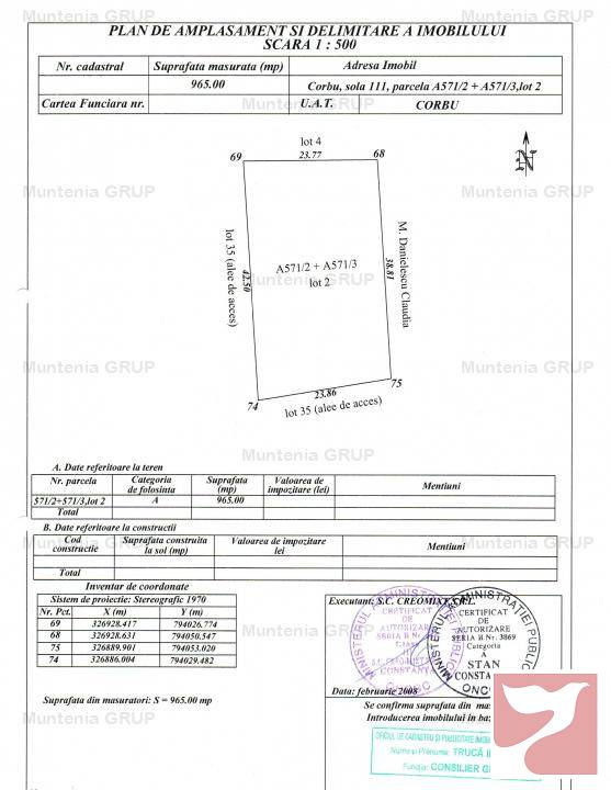 CORBU ( in zona plajei Corbu) – vanzare teren in suprafata totala de 965 mp. cu laturile de 24 m. x 39 m. situat in intravilan, Sola 111, Parcela A 571, Cadastru si Intabulare, PUZ - INTRAVILAN, cu acces direct din strada betonata.