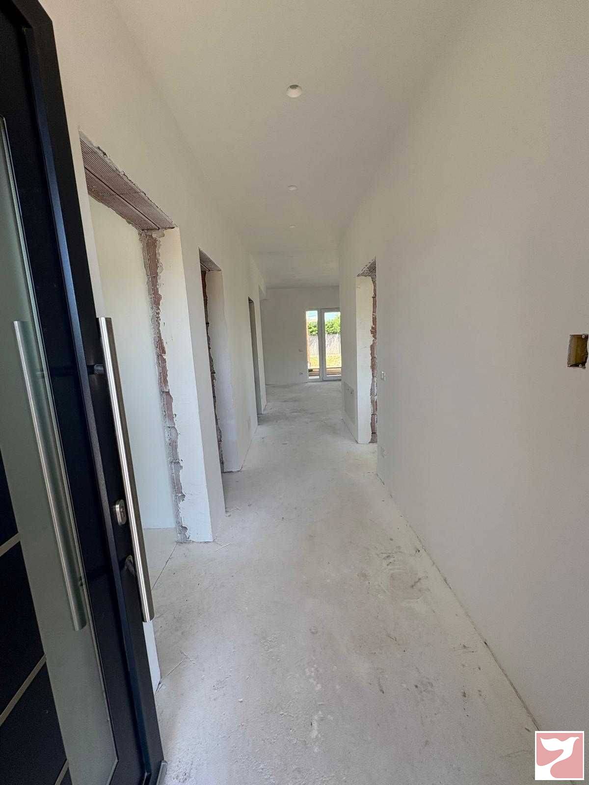 Vand casa semifinisata la intrare Osorhei, la 2min de Lidl George Bacaloglu si cartierul Tineretului. Casa este asezata pe un teren de 536mp, suprafata construita 157 mp, suprafata utila 110, 85+19, 25mp terasa acoperita. Casa este compusa din: 2 dormitoare, unul cu baie proprie, living, bucatarie separata, o baie mare, dressing, hol, terasa acoperita. Instalatia electrica cu doze si prize made in Italy, in fiecare incapere aprox 10buc, prevazut pt ac in fiecare incapere, si pt casa inteligenta, incalzire in pardoseala, (polistiren 5cm+polistiren cu nuturi) cu distribuitoare in bai pt fiecare obiect. In bai rezervor wc geberit incastrat in perete ambele, rigole de scurgere . Interior tencuit mecanizat, 2 maini de glet, slefuit, dispersit alb. Exterior izolat polistiren de 10cm, pazie aparenta din lemn vopsit alb, tencuiala decorativa, burlane montate. Geamuri tamplarie pvc cu 3sticle, 7camere, 4anotimpuri culoare antracit exterior alb interior, pervaze granit. Podul casei izolat vata bazaltica, acoperis cu tigla Bramac . Casa imprejmuita de garduri. Utilitati:apa put forat, curent trifazic, fosa septica. La nevoie poate fi compartimentata in 3 camere.