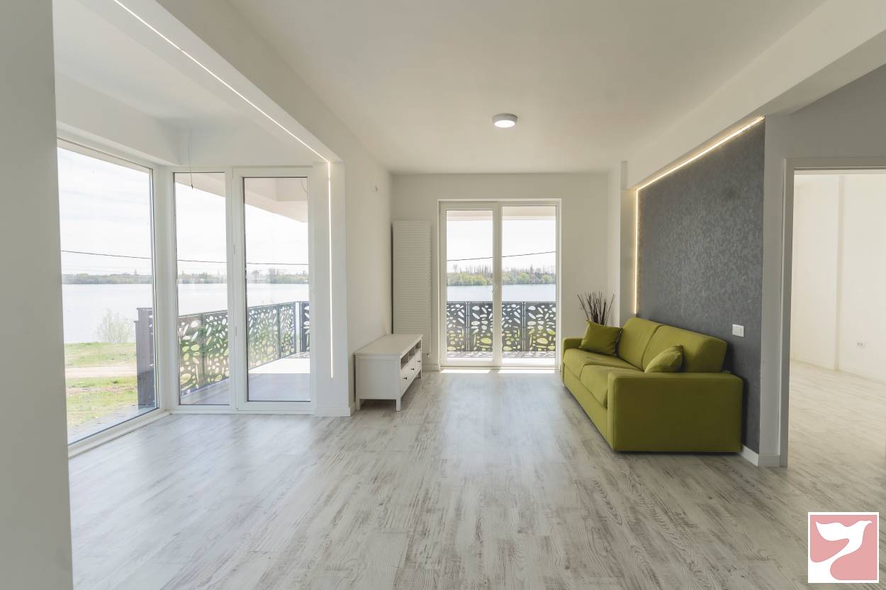 Ferestrele largi deschid incaperile catre lac si catre cer, iar lumina naturala insoteste spatiul de dimineata pana seara. In jur - apa, cer, aer curat. Parcarea complexului este gratuita pt locatari. 58 mp utili