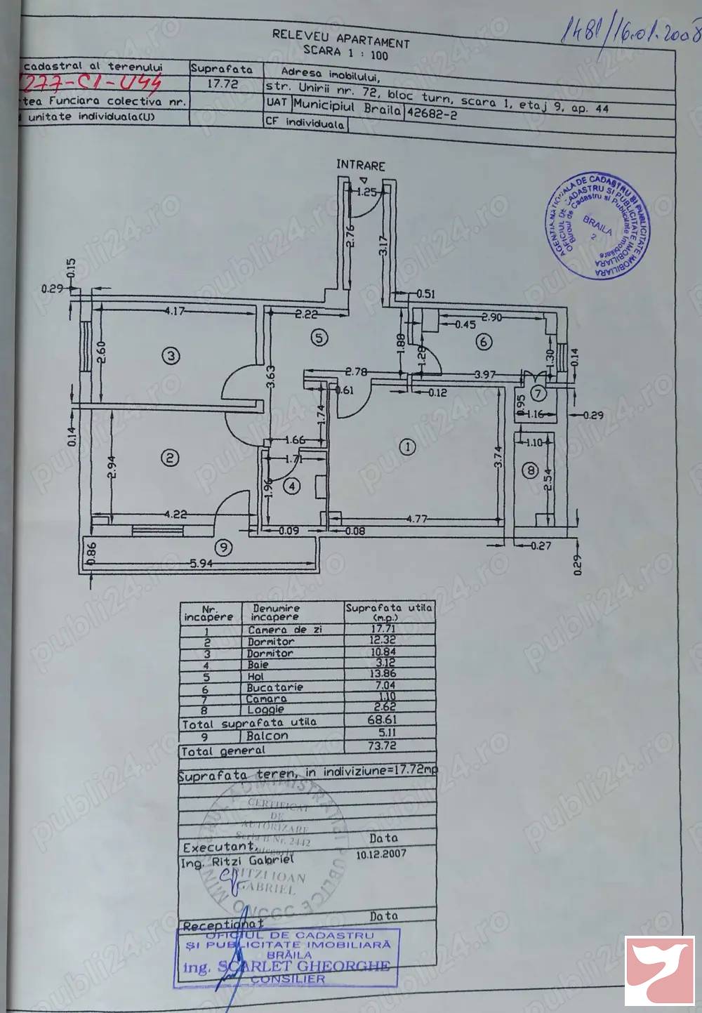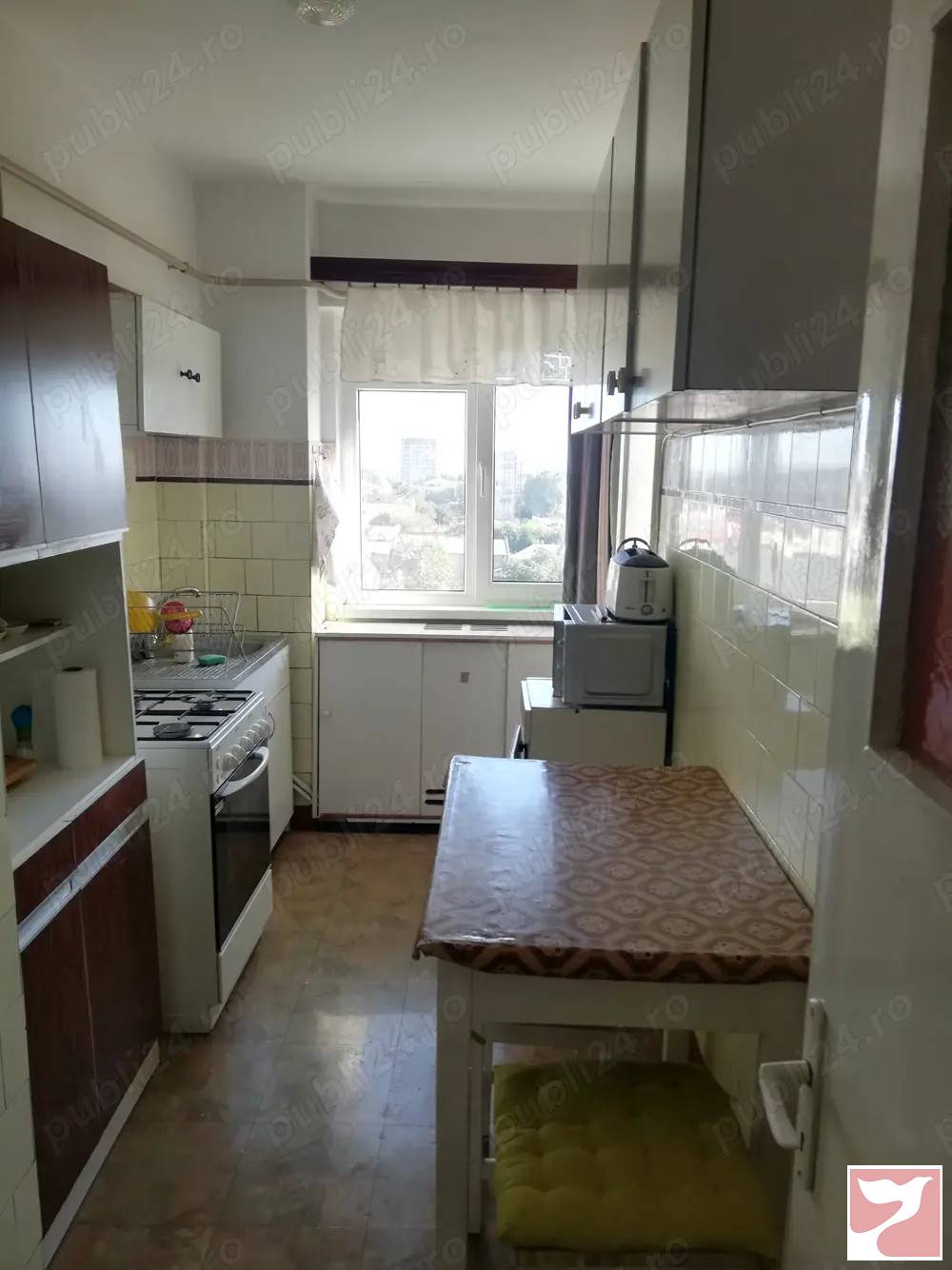 - Apartament ultra-central in Braila, blocul turn langa Winmarkt, strada Unirii nr.72, etajul 8 din P+10, 2 lifturi noi, - Bloc construit in 1976 foarte rezistent: structura stalpi si grinzi beton armat, pereti caramida, izolatie exterioara pe 3 fatade - Vedere frumoasa triplu orientat : sud-est spre biserica Bulgareasca si Muntii Macin (living si bucatarie), nord-vest Bd Independentei (camera mica) si sud-vest strada Unirii (camera mare si balcon deschis)- 3 camere decomandate, bucatarie, baie, hol, camara, 2 balcoane dintre care cel de la living tip logie inchisa cu termopan, izolatie exterioara pe 3 fatade, termopane- Dotari: gaze, parchet lemn, gresie, termopane, centrala gaz proprie (incalzire si apa calda), climatizare. - Mobilierul este inclus in pret : dulap integrat hol, biblioteca living, canapea, sifoniere, covoare persane, perdele etcMai multe informatii pe email