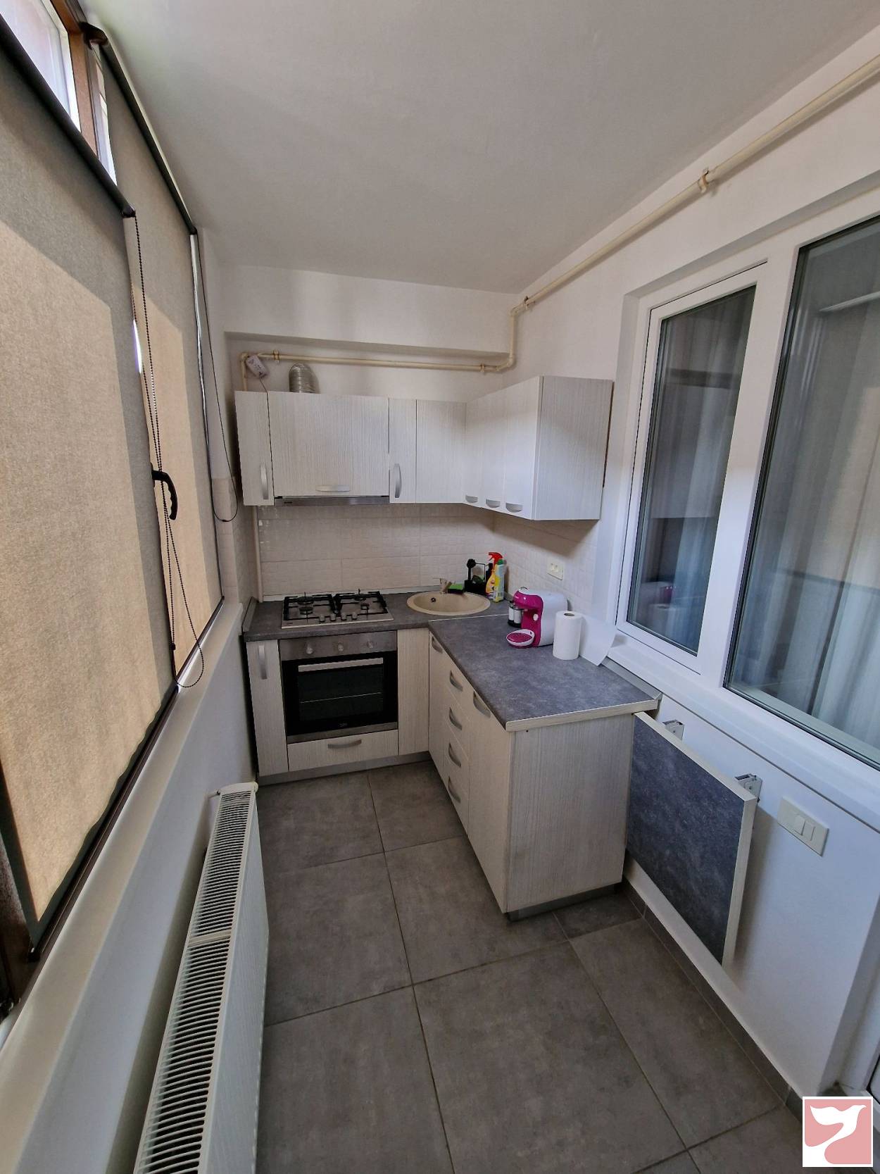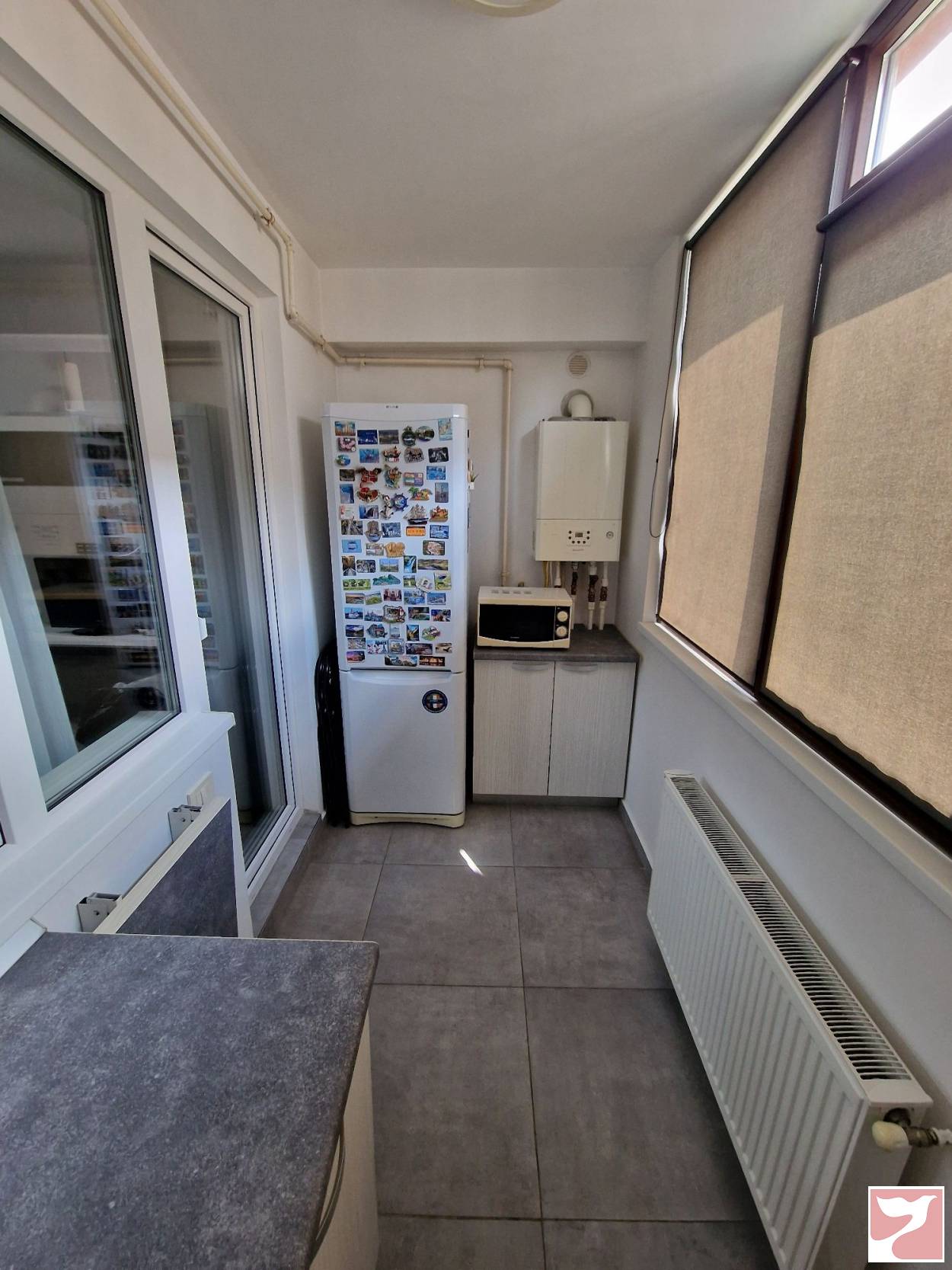 Bucatarie inchisa - dotata cu frigider, aragaz, cuptor cu microunde, aparat de cafea. Baie - masina de spalat. Centrala pe gaz proprie cu termostat ambient