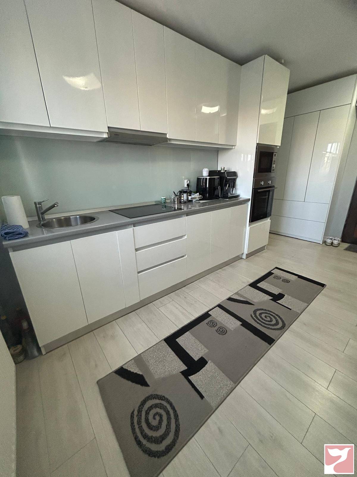 - Electrocasnice: plita pe inductie, cuptor electric, cuptor cu microunde incorporat, hota, combina frigorifica
